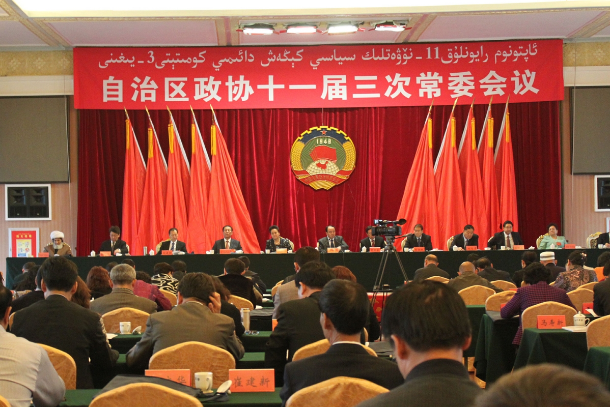 ??????? 2013年11月4日-5日,自治区政协十一届三次常委会议在乌鲁木齐召开,围绕“基础设施现代化建设”主题建言献策。自治区政协主席努尔兰?阿不都满金主持会议?;嵋榇锪酥醒胝尉殖N⑷飨嵴宰灾吻匙椤豆赜诘鼻靶陆泄毓ぷ髑榭龅谋ǜ妗返闹匾?,中央政治局委员、自治区党委书记张春贤对自治区政协工作的重要指示。