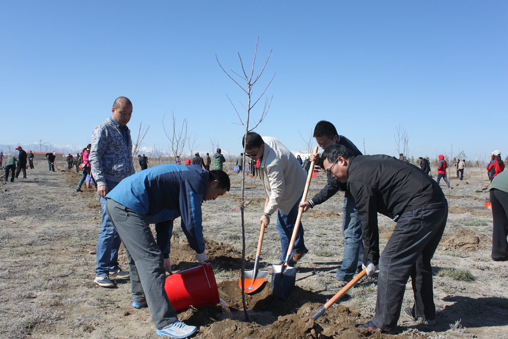 ??????? 2014年4月18日,自治区政协组织部分自治区政协委员、乌鲁木齐市和乌鲁木齐县政协委员,各民主党派新疆区委会、各民主党派乌鲁木齐市委会成员等共200余人,来到乌鲁木齐县城市郊区万亩林绿化基地参加义务植树活动,为首府再添新绿。