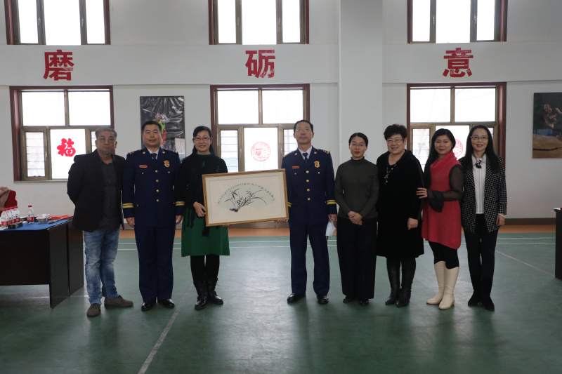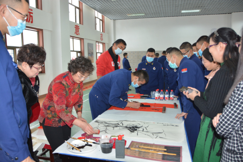 演出开始前,民盟新疆区委会向森林消防总队赠送书法作品80余副,赠送美术作品5副,并且开展了以字画会友活动,盟员蒋先红、王彤在现场挥毫泼墨,与官兵们交流绘画和书法的心得与技巧,各位专业老师们还亲身进行教学示范,指导官兵书写春联和福字,大家兴致勃勃,纷纷提笔写下自己对祖国和亲人的美好祝愿。